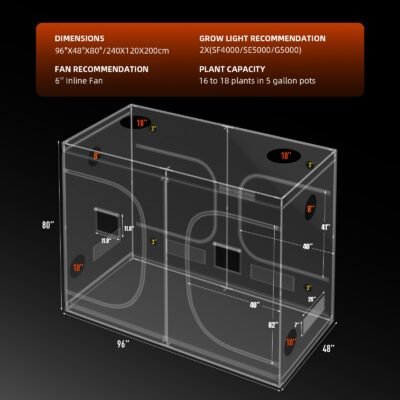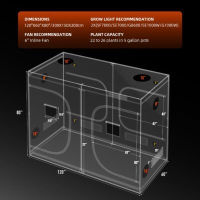 - 🌱 XXL Growzelt für 14–18 Pflanzen 💡 Optimal für 2×1000W LED-Lampen (z. B. SF7000, SE1000W) 🛡️ Robustes 1680D Oxford-Gewebe & Stahlrahmen 🔄 100 % reflektierend für maximale Lichtnutzung 💧 Wasserdicht, lichtdicht & stabil bis 110 kg