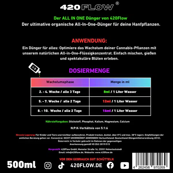 Die Anwendung des Der All in One Dünger 420flow ist bewusst einfach gehalten. Dank klarer Dosierung bleibt die Kontrolle jederzeit bei Dir. Kein komplizierter Düngeplan, kein Phasenwechsel, kein Produktchaos. Einfach regelmäßig anwenden und die Entwicklung Deiner Pflanzen beobachten.