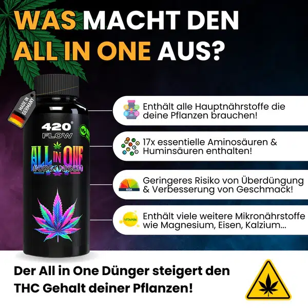 Der Der All in One Dünger 420flow ist die einfache, natürliche und zuverlässige Lösung für alle, die ihre Pflanzen vom ersten Keimling bis zur Ernte optimal versorgen möchten. Dieser hochwertige Komplettdünger begleitet Deine Pflanzen durch Wachstum und Blüte, ohne dass Du zwischen verschiedenen Produkten oder Düngeschemata wechseln musst. Ein Produkt, ein System, volle Kontrolle.