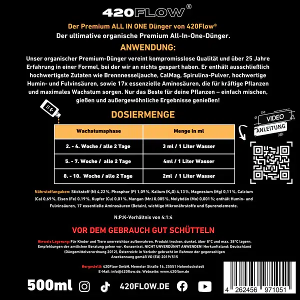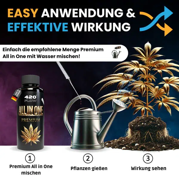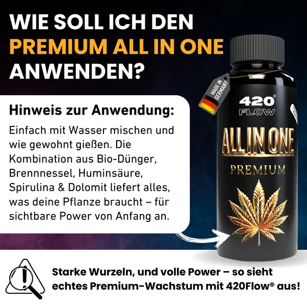 Der Premium All in One von 420Flow® liefert volle Nährstoffpower in nur einer Flasche und versorgt Deine Pflanzen zuverlässig von der frühen Wachstumsphase bis zur späten Blüte. Die ausgewogene Kombination aus organischen Komponenten sowie Mikro und Makronährstoffen unterstützt vitale Wurzelbildung, kräftiges Blattwachstum und eine stabile, leistungsfähige Pflanzenstruktur. Einfach in der Anwendung, effizient im Ergebnis und konsequent natürlich – ideal für alle, die maximale Wirkung ohne Produktwechsel wünschen.