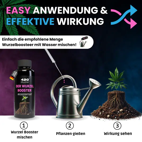 Der Wurzelbooster wird ab dem ersten Gießen eingesetzt. Besonders sinnvoll ist die Anwendung bei Stecklingen, nach dem Umtopfen oder bei sichtbarem Stress. Einfach dem Gießwasser beimischen. Die exakte Dosierung ist auf dem Etikett angegeben.