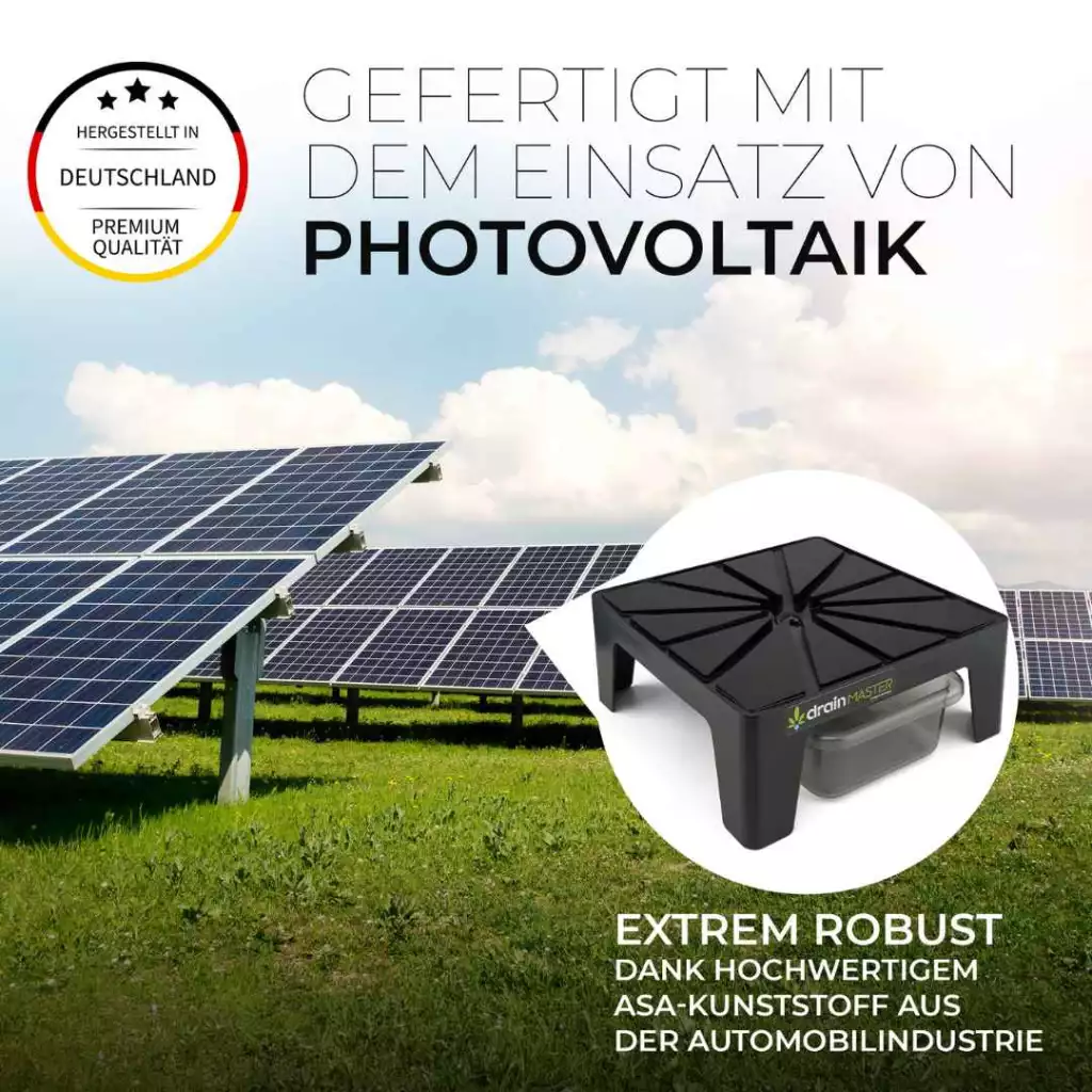 Der Abtropfständer bietet eine maximale Standfläche von 24 cm x 24 cm und Platz für große Töpfe. Mit einer Höhe von nur 10 cm hältst du den Platzverlust in deiner Growbox klein. Die Auffangschale mit einem Fassungsvermögen von 1,4 Litern sorgt dafür, dass deine Pflanzen nie im eigenen Wasser stehen und Wurzelfäule effektiv verhindert wird.