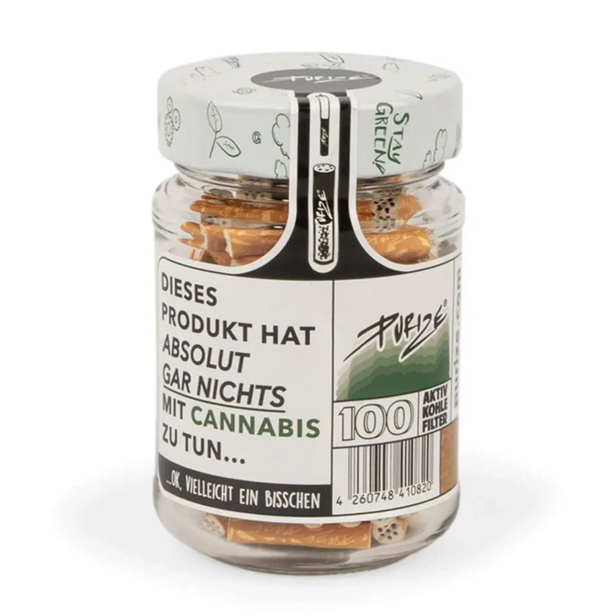 Die PURIZE® XTRA Slim Size Aktivkohlefilter in der Spion Edition sind optisch nicht von herkömmlichen Zigarettenfiltern zu unterscheiden – perfekt für diskrete Momente. Verpackt im wiederverwendbaren Glas mit 100 Stück, bekommst du Style, Funktion und Nachhaltigkeit in einem.