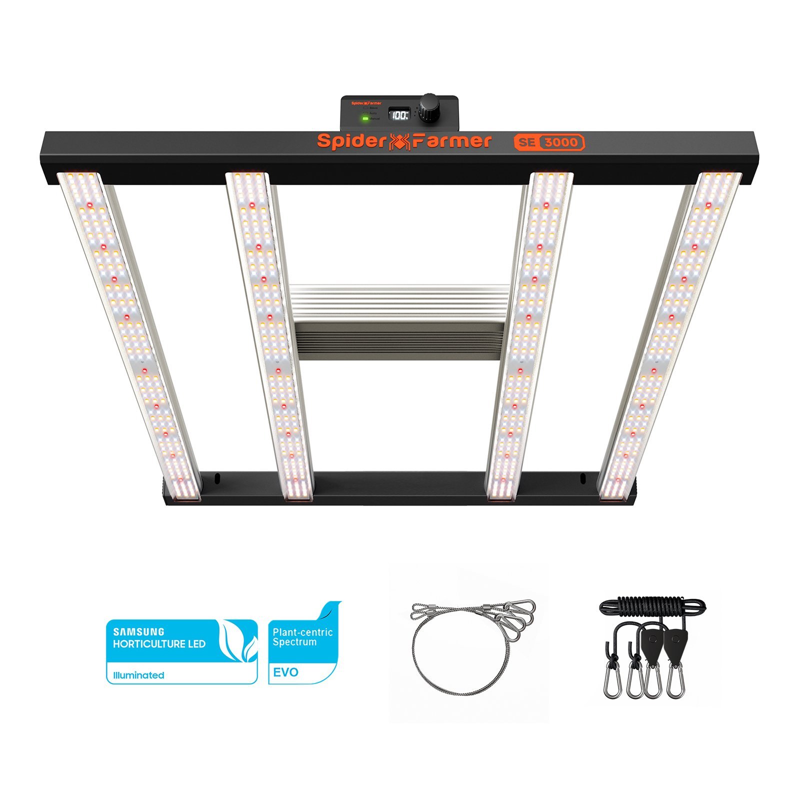 Die Spider Farmer SE-3000 300W LED Growlampe gehört zu den beliebtesten Lampen für Indoor-Grower, die Wert auf maximale Effizienz, smarte Steuerung und ein gesundes Pflanzenwachstum legen. Mit den neuesten Samsung LM301H EVO Dioden, einem PPE-Wert von 2,85 μmol/J und einem PPF von 856 μmol/S bietet sie ein unschlagbares Preis-Leistungs-Verhältnis.