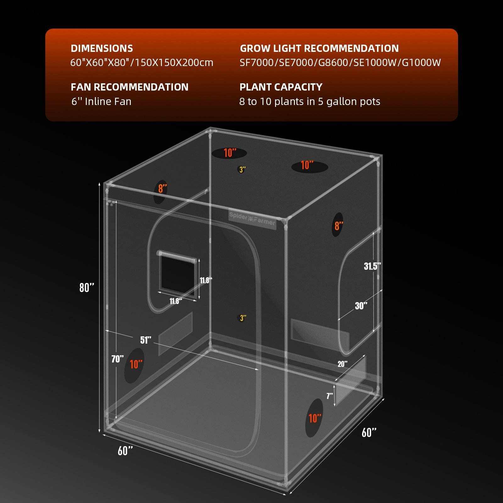 - Growzelt: 150×150×200 cm (5×5 ft)