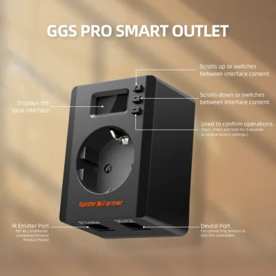 - Smarte Steckdose für Indoor-Grow Bis zu 3680W Leistung bei 16A Steuerung über die Spider Farmer App Automatisierung per Sensor möglich Ideal für Geräte anderer Hersteller Teil des GGS Grow Genius Systems